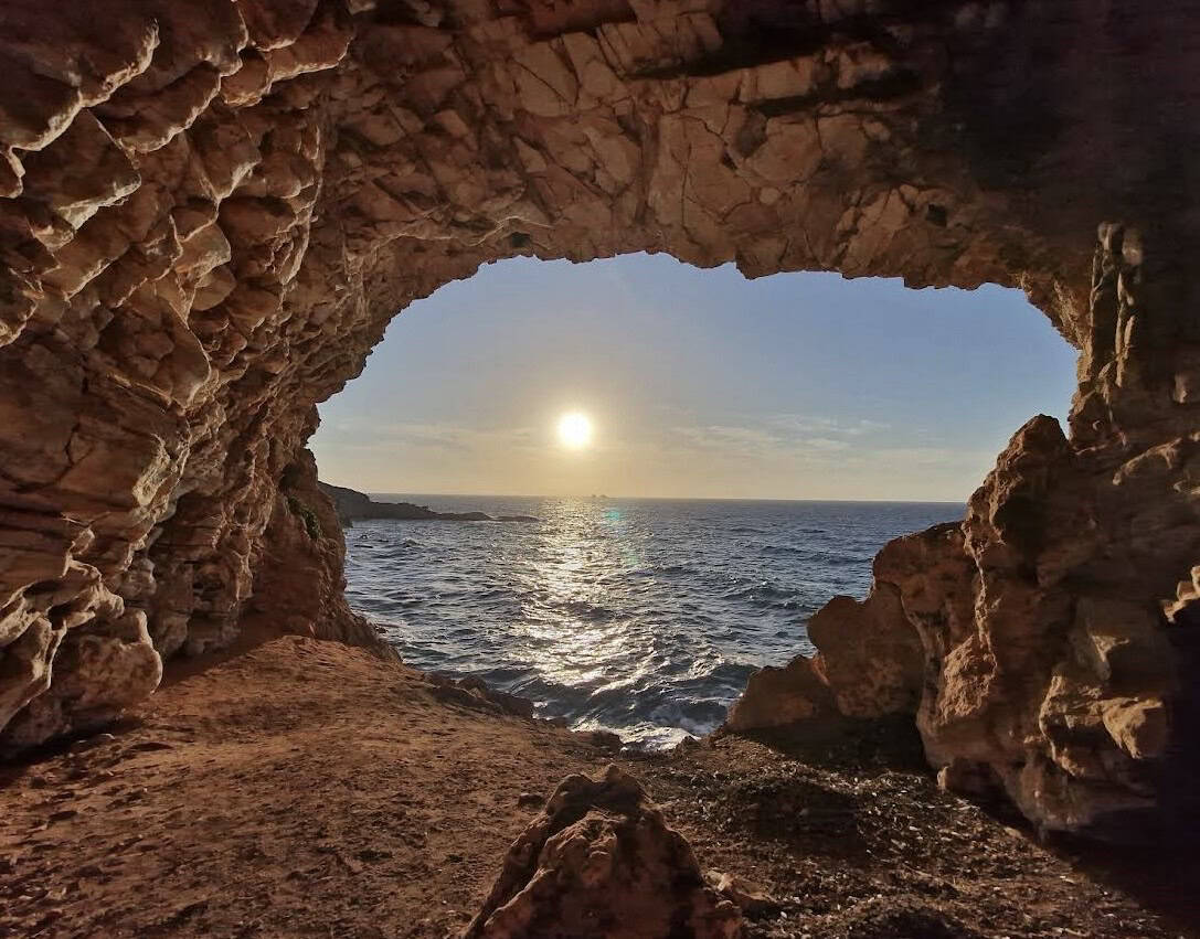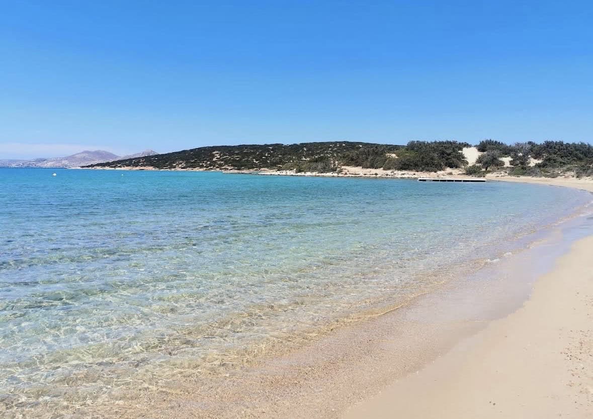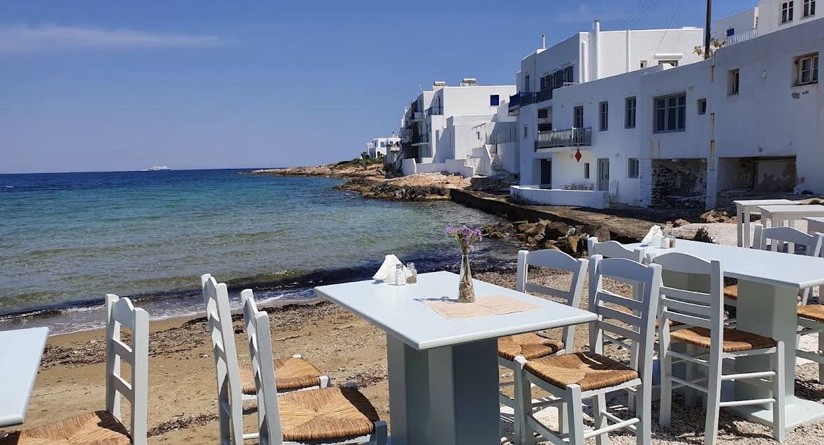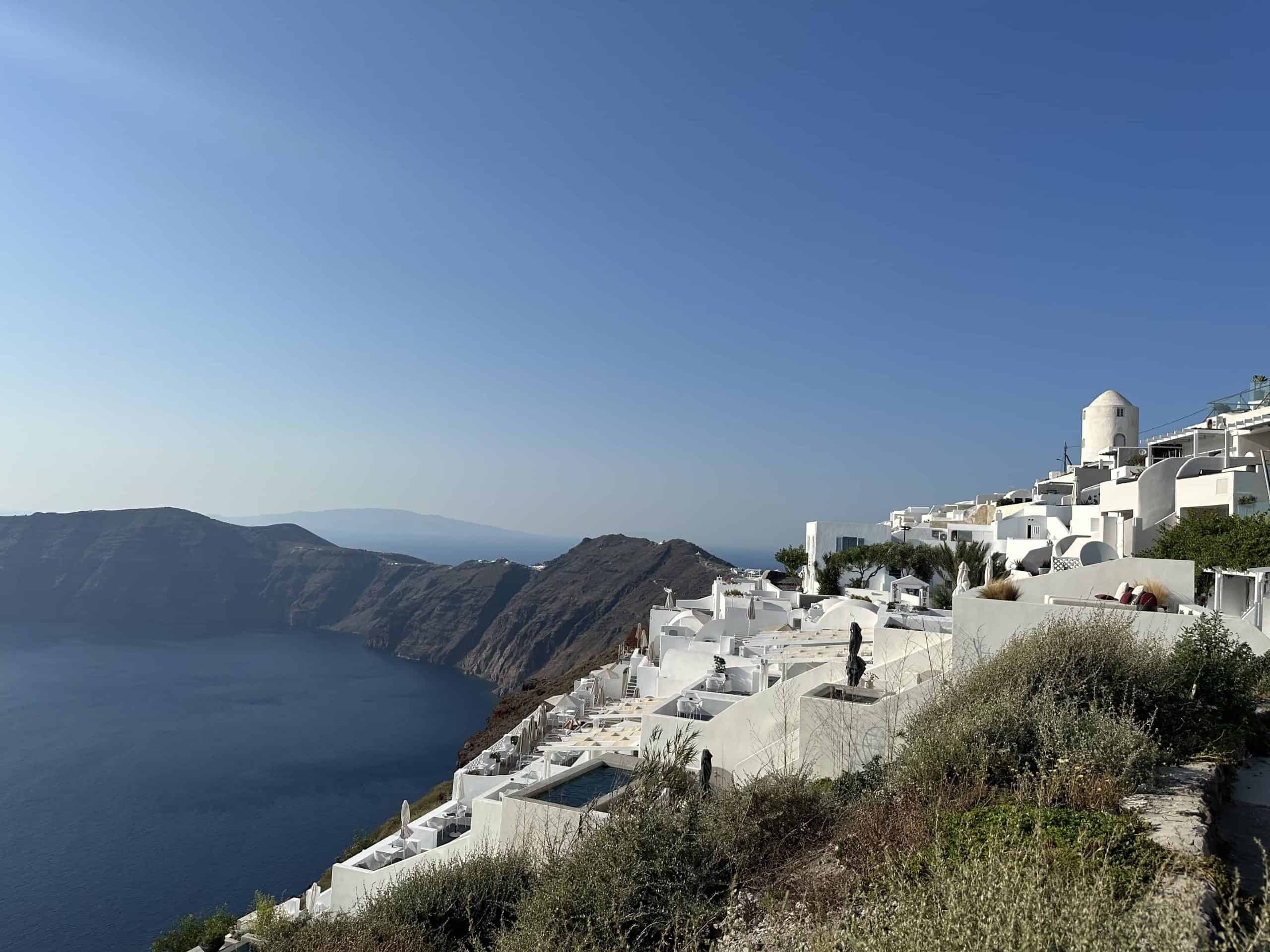 An arch with beautiful pink flowers in Oia, Santorini, Greece.